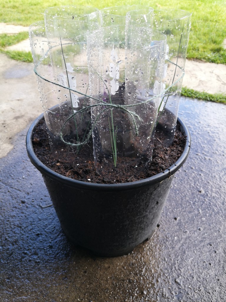 Since we are all in lock down, we thought we would try and carry on with a few gardening experiments. I’ve seen people grow leeks in pots using recycled drinks bottles as mini greenhouses to draw the leeks up, before blanching using some old roofing felt or similar – so here goes! The leek is ‘Stocky’