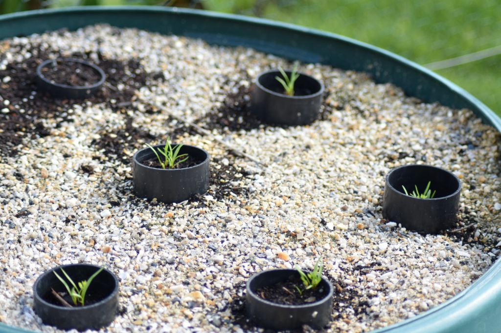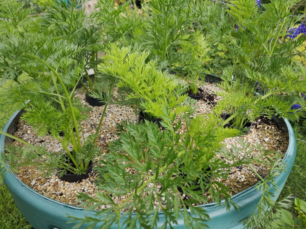 Long pointed carrots (St Valery) emerging in the repurposed water butt, filled with sharp sand and with cores of compost inserted where sand has been ‘excavated’ using a 3 inch drainpipe.