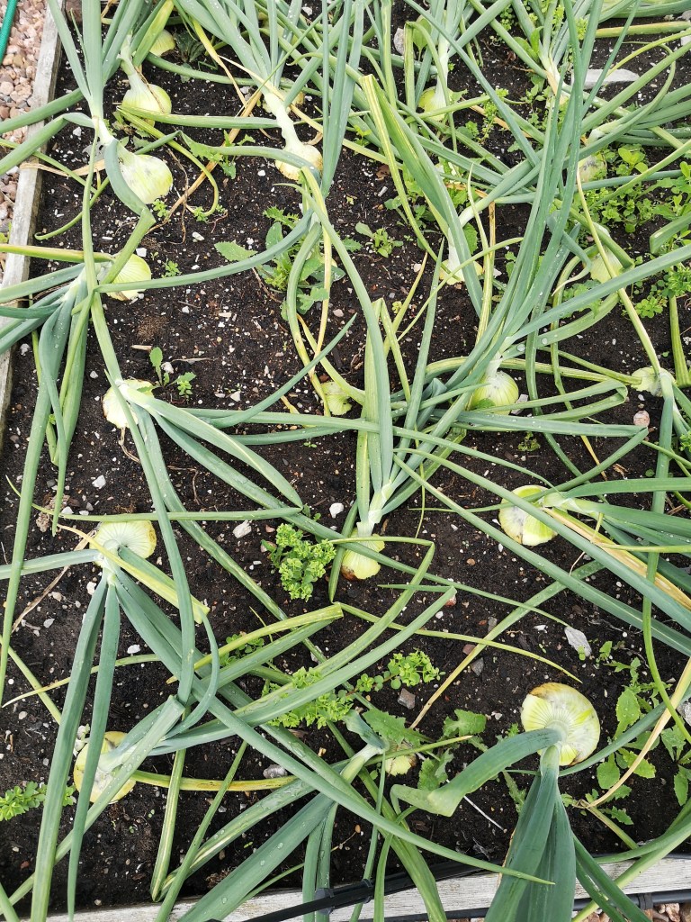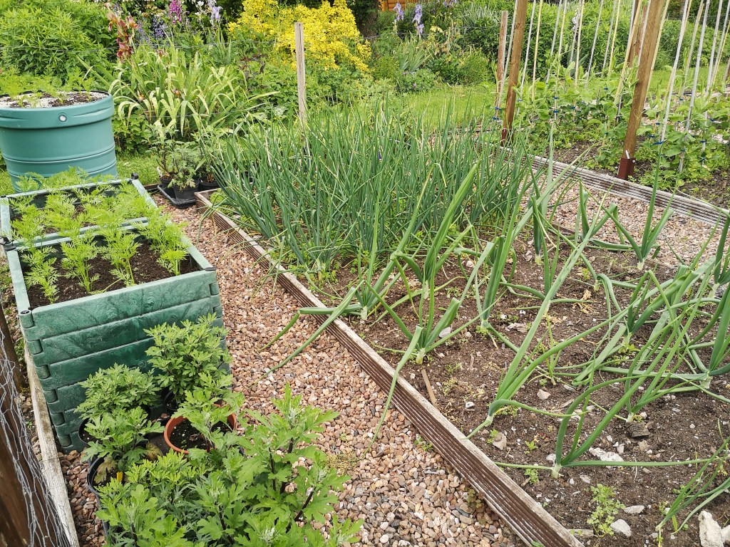 A picture of the onions, shallots and carrots, with the cordon sweet peas in the background. The onions have been a real struggle this year after a cracking season in 2020. Not sure if it is the compost, the season, or both!