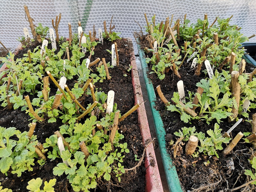 A job for the New Year? A quick inspection of the chrysanthemum stools (which have been in a frost free greenhouse since lifting a few weeks ago) suggests that a few cuttings will be ready to take early in the New Year.