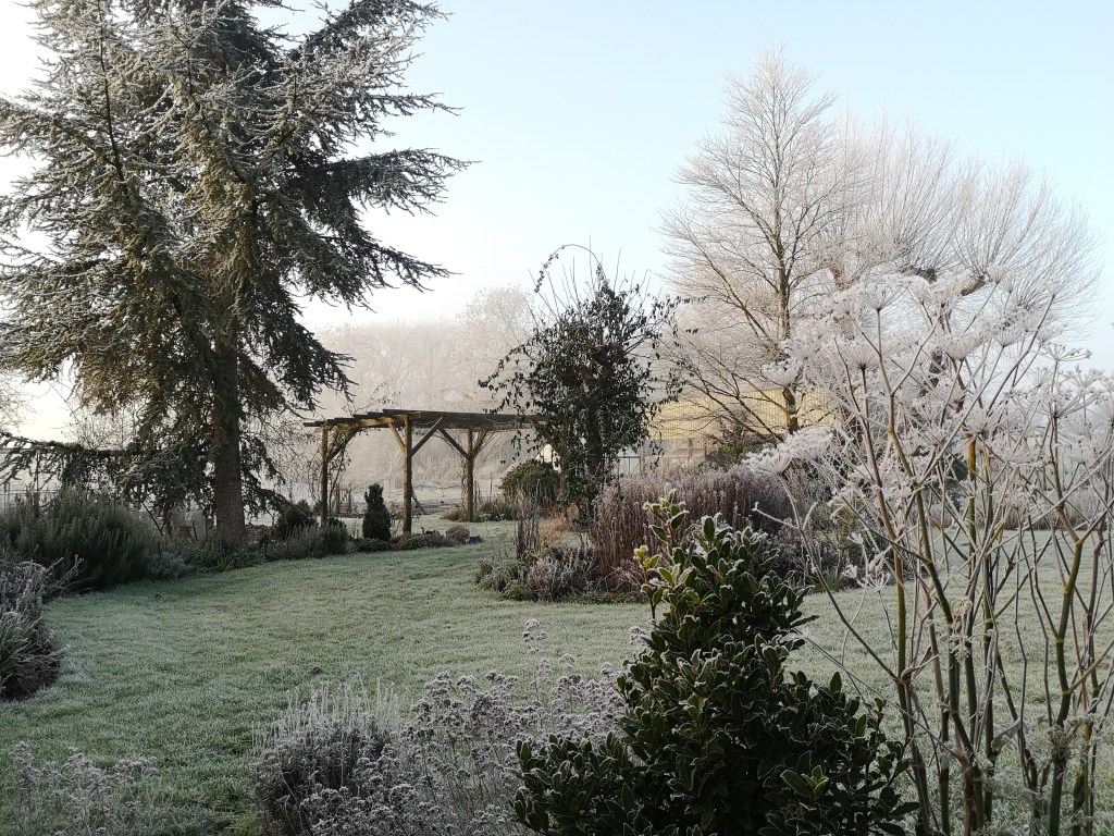 Late December and a heavy frost arrives. We leave the herbaceous beds until January and February before we start tidying up, so the seed heads are popular with the birds.