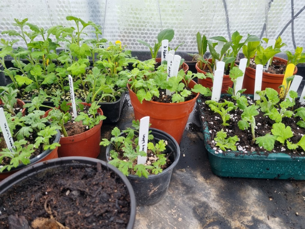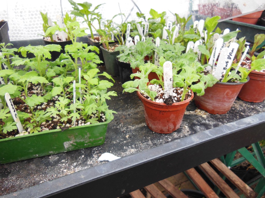 Inside the propagator, in the main greenhouse, everything is starting to get underway. Chrysanth cuttings and the first few dahlia cuttings (to be used as mother or stock plants)