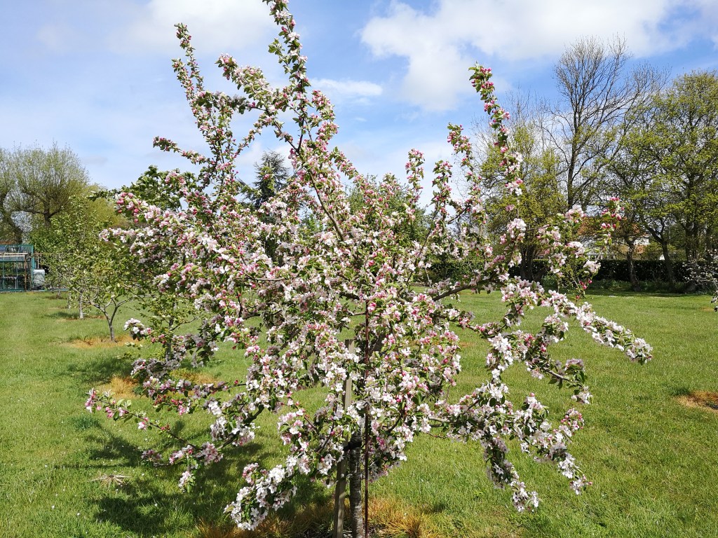 The orchard has suffered under the heavy frosts in April, but some of the later flowering trees are looking good now – Crab Apple ‘Butterball’.