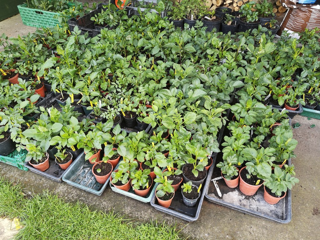 It’s the beginning of May, and space is at a premium. The ‘big sort’ of dahlias starts, as they are removed from greenhouses to harden off and are sorted into varieties ready for planting.