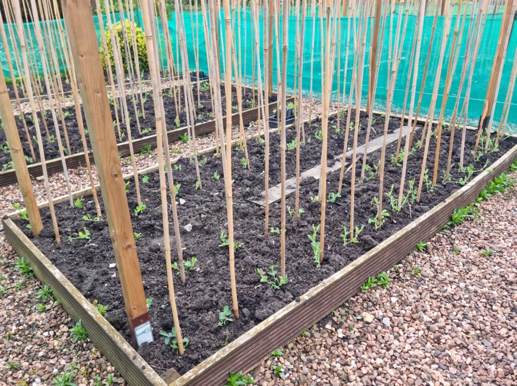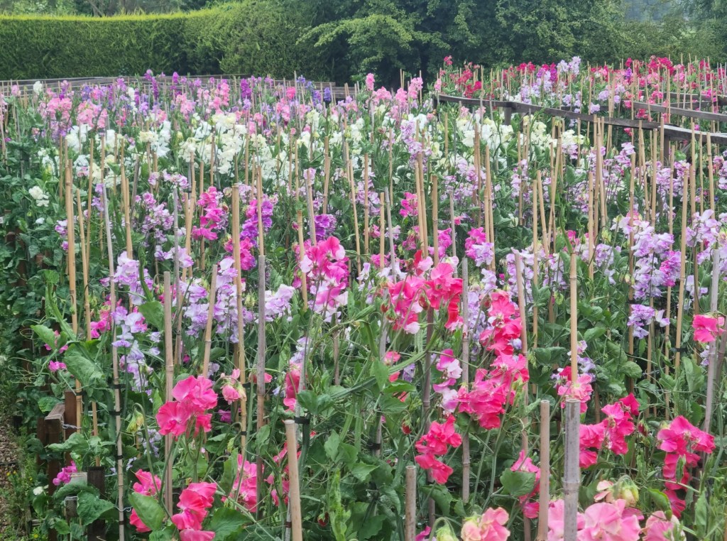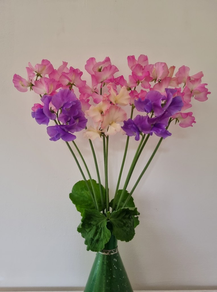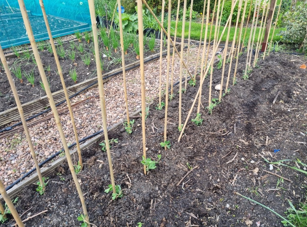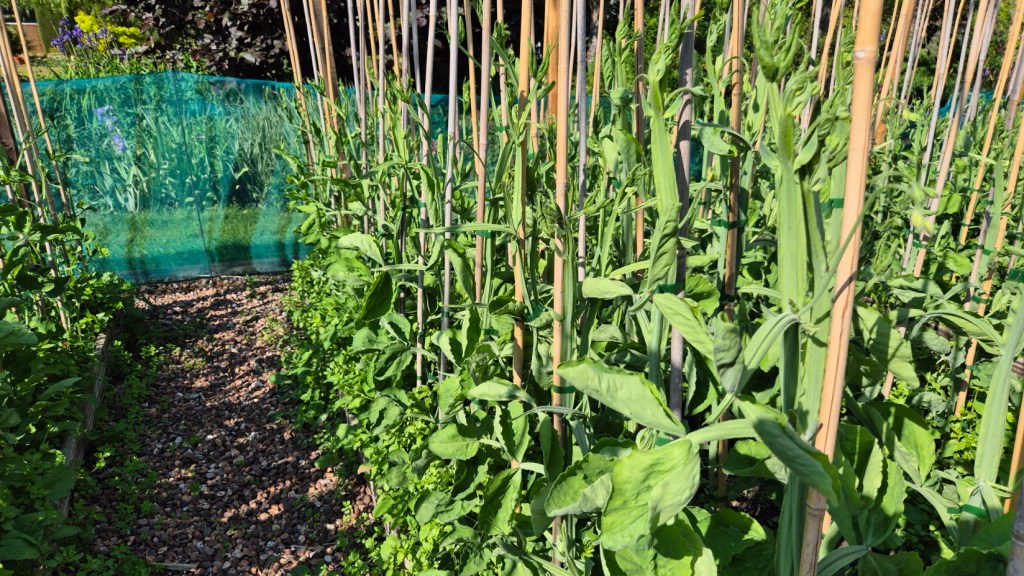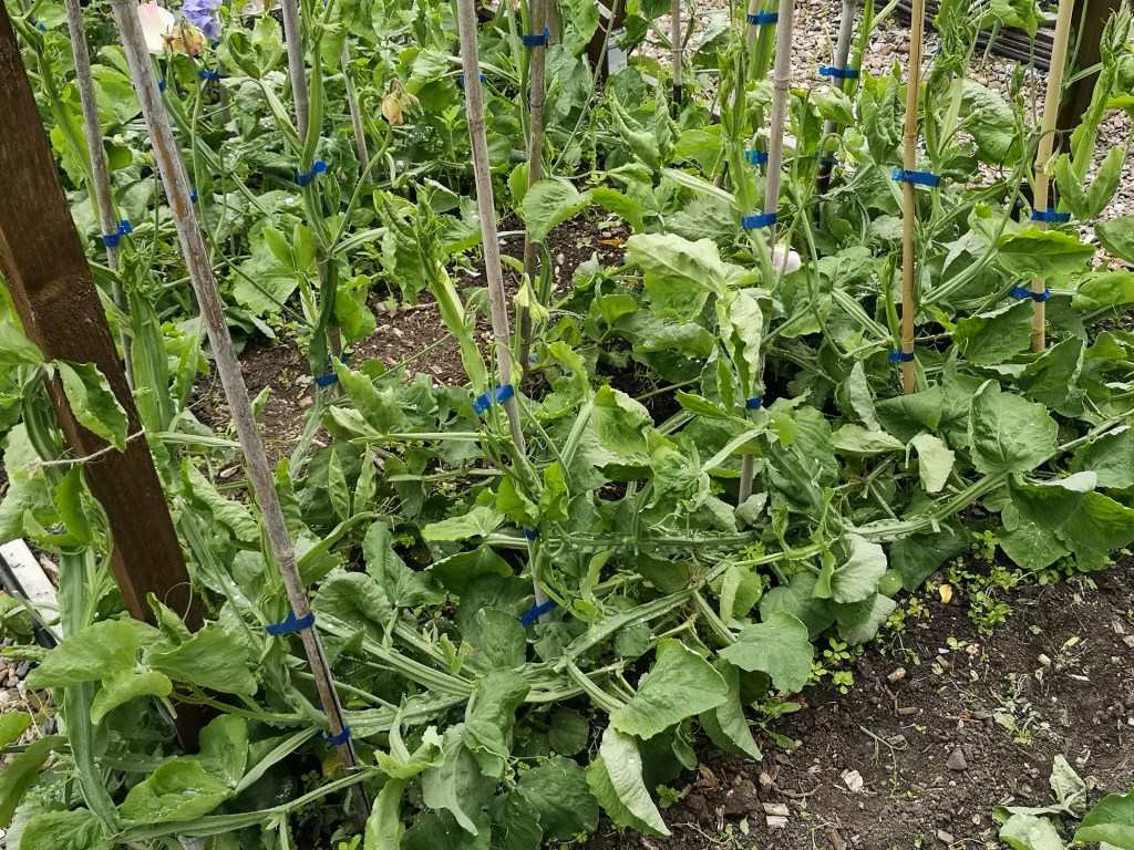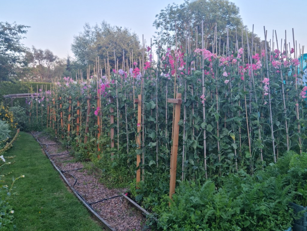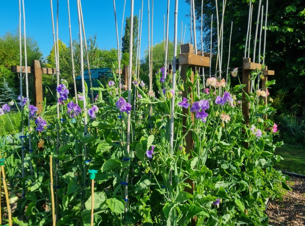 What a difference a year makes – the sweet peas are far more advanced than at the same time in 2024. The first colour appears by about 15th May. They are terribly weedy, but that’s partly lack of effort on my part but also acts as a bit of a mulch to keep the base of the plant cool/moist in the dry weather. It doesn’t look pretty, but seems to work!