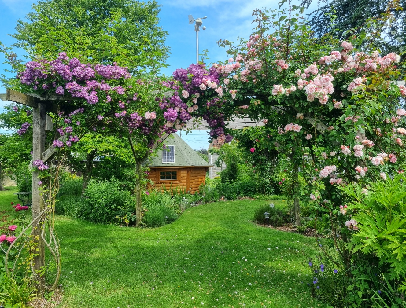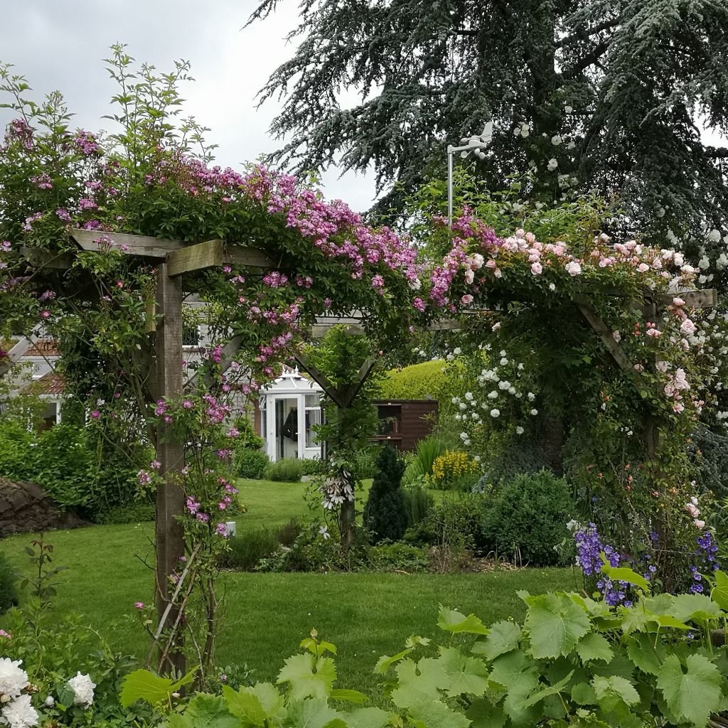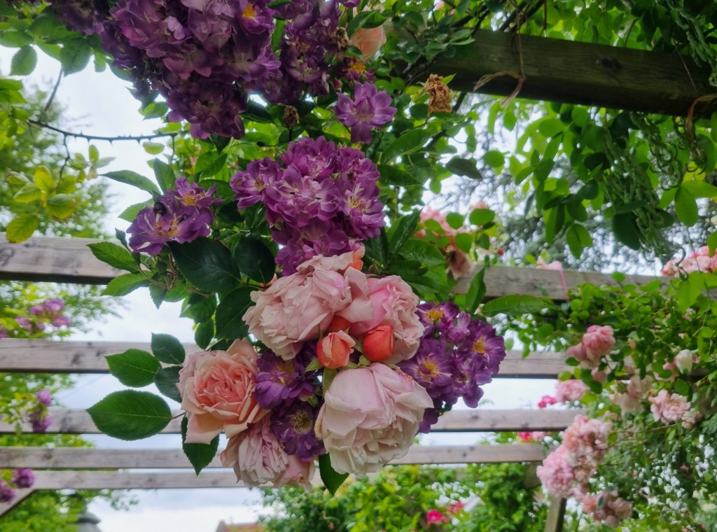 The roses on the pergola are now reaching their peak.