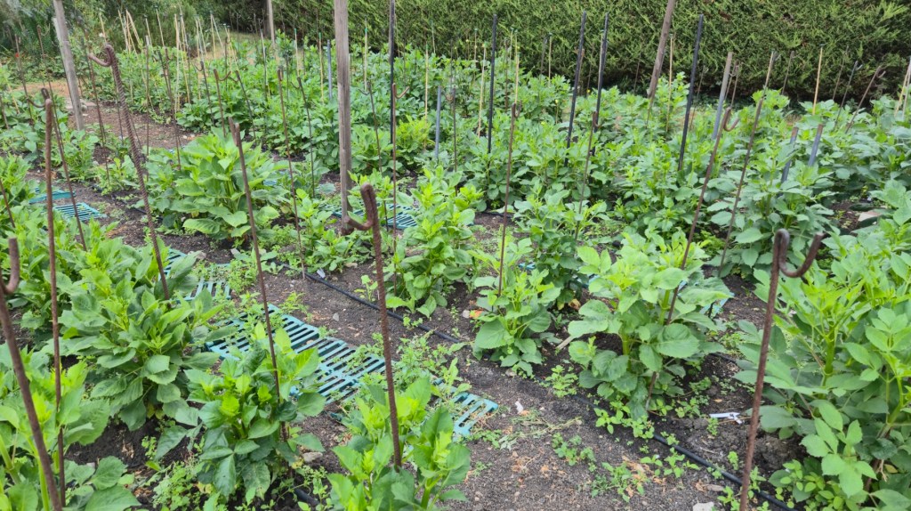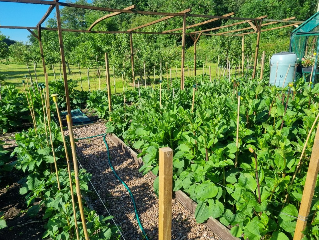 The smaller of the two main dahlia plots a few days before the Taunton and Castle Cary shows. After a strange and late start to the season, dahlias in the Taunton bed came through ok.