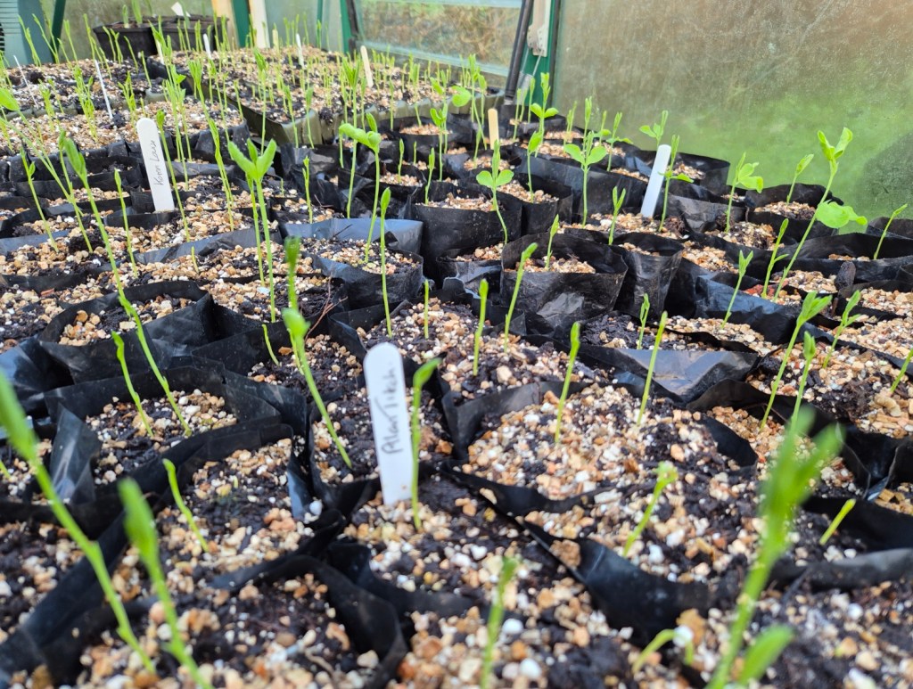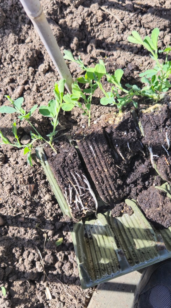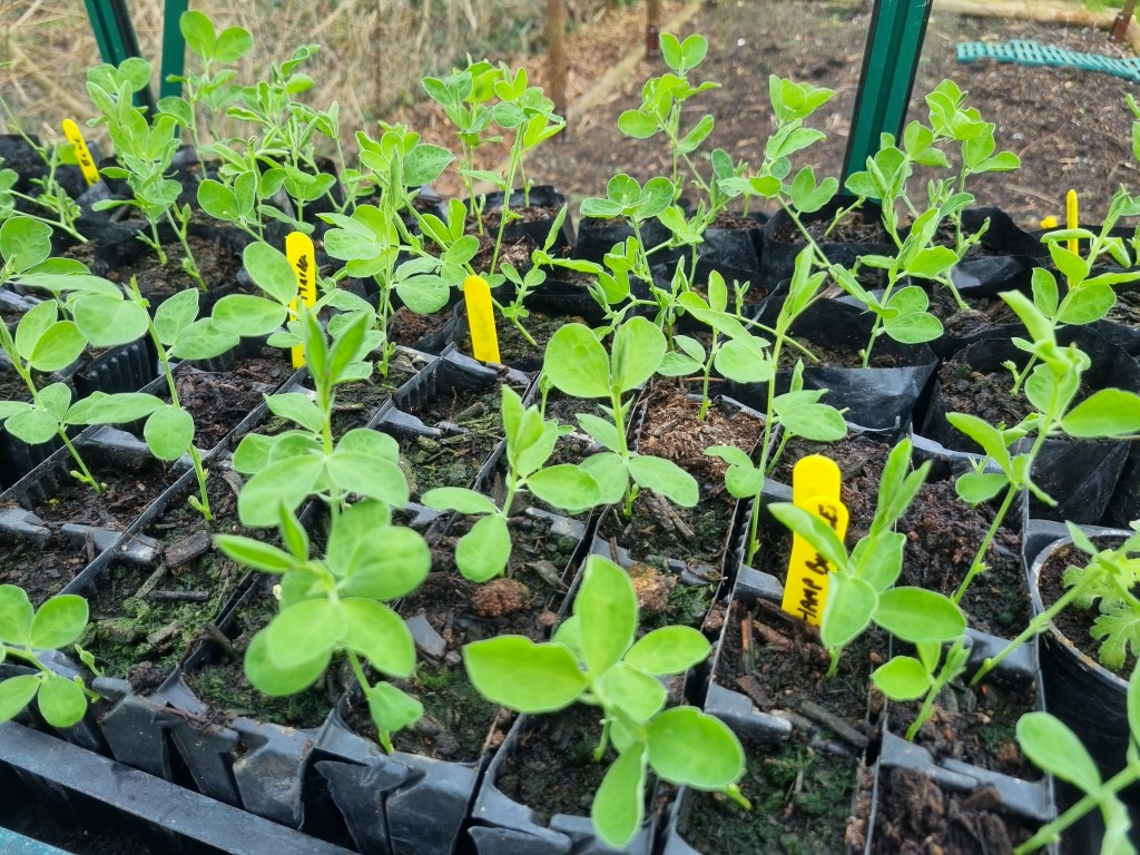 The sweet peas are nearly ready for planting in a few weeks. Need a bit more hardening off.