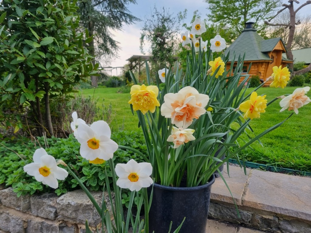 The final few pots of daffodils in the garden. Here we have daffodil Clovelly Ayr (front), Daffodil Delnashaugh, (middle) Daffodil Merlin (back). The yellow double in the middle pot is supposed to be Daffodil Heamoor, but isn’t!