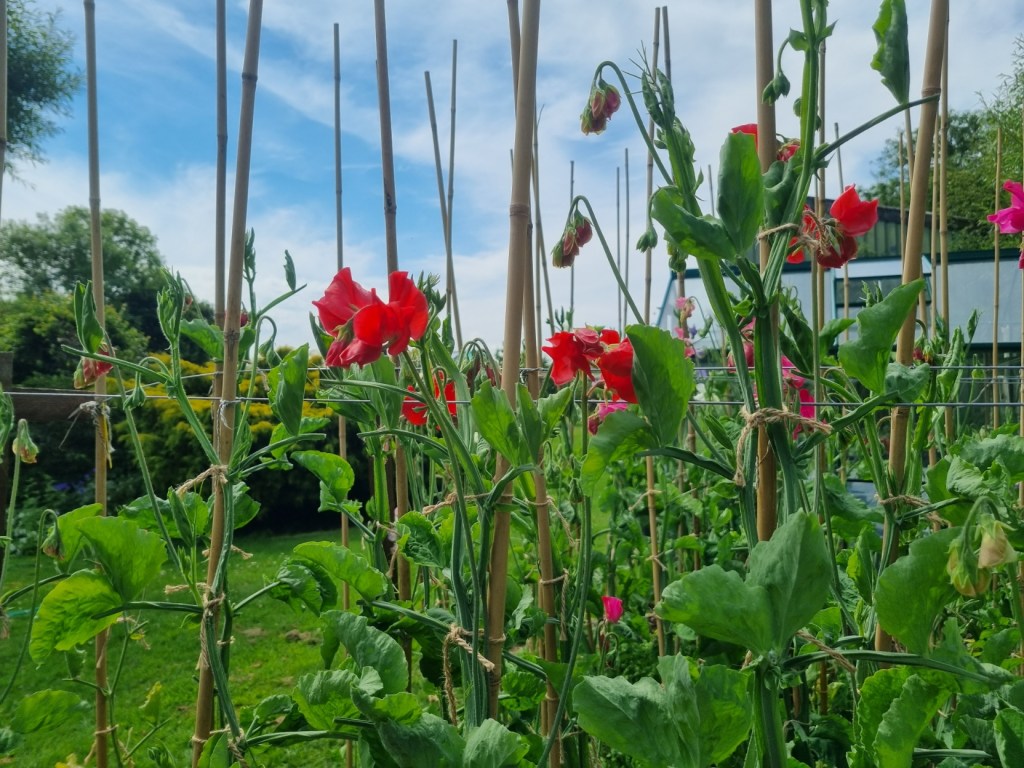 The sweet peas have been a bit of a struggle this year and not as good as 2021. They are coming through much later than planned, and with significant losses and some rogue-coloured plants this year – making it difficult to get a matching set. With the better weather this week, the Hannah Mcgovern (red) are looking quite striking.