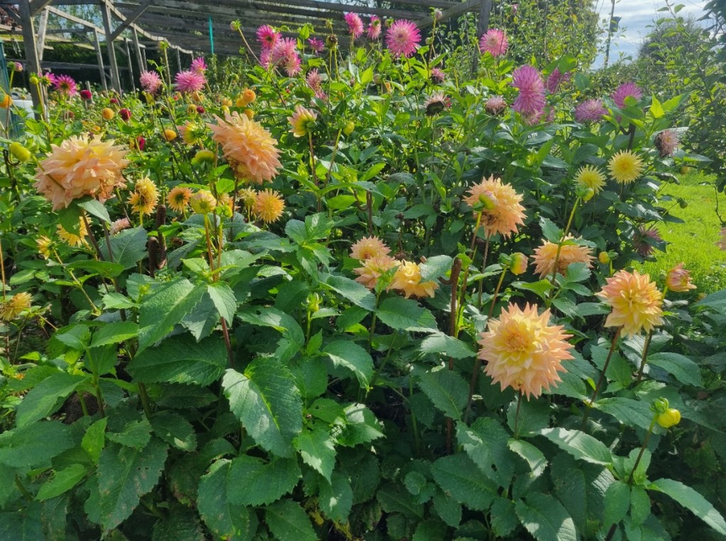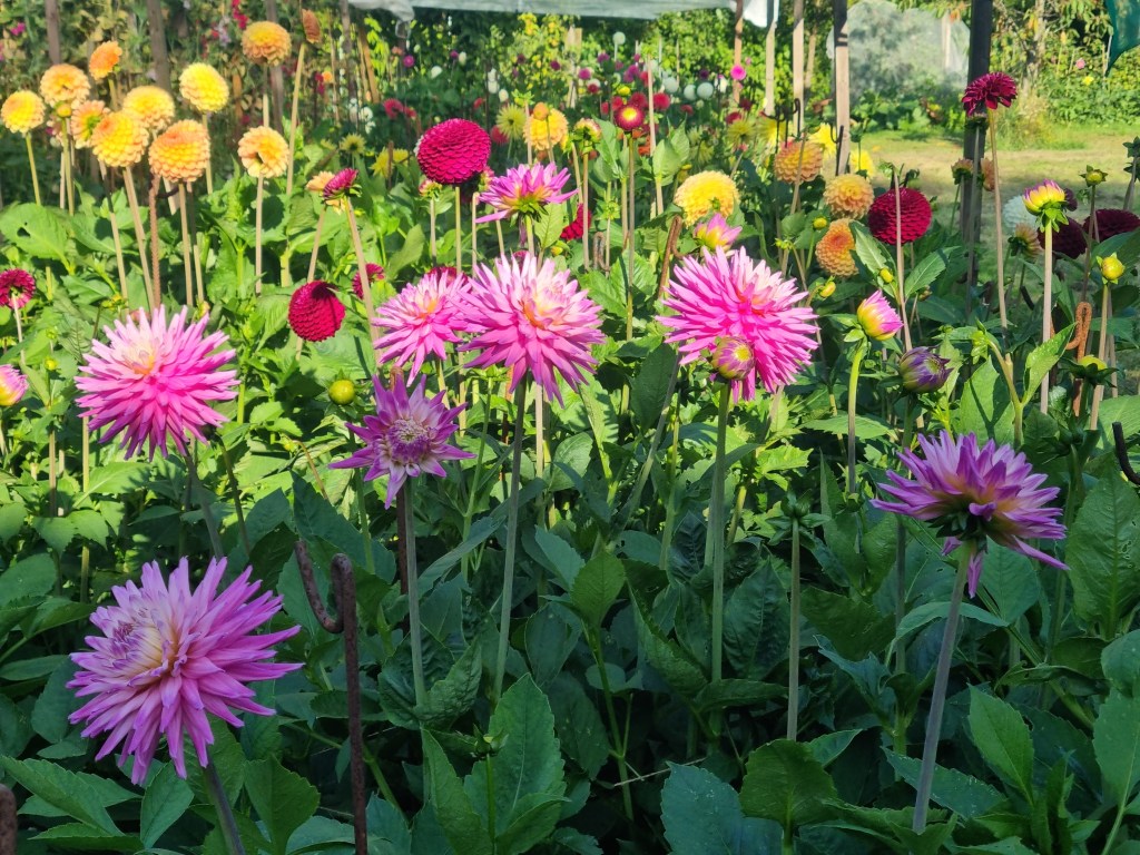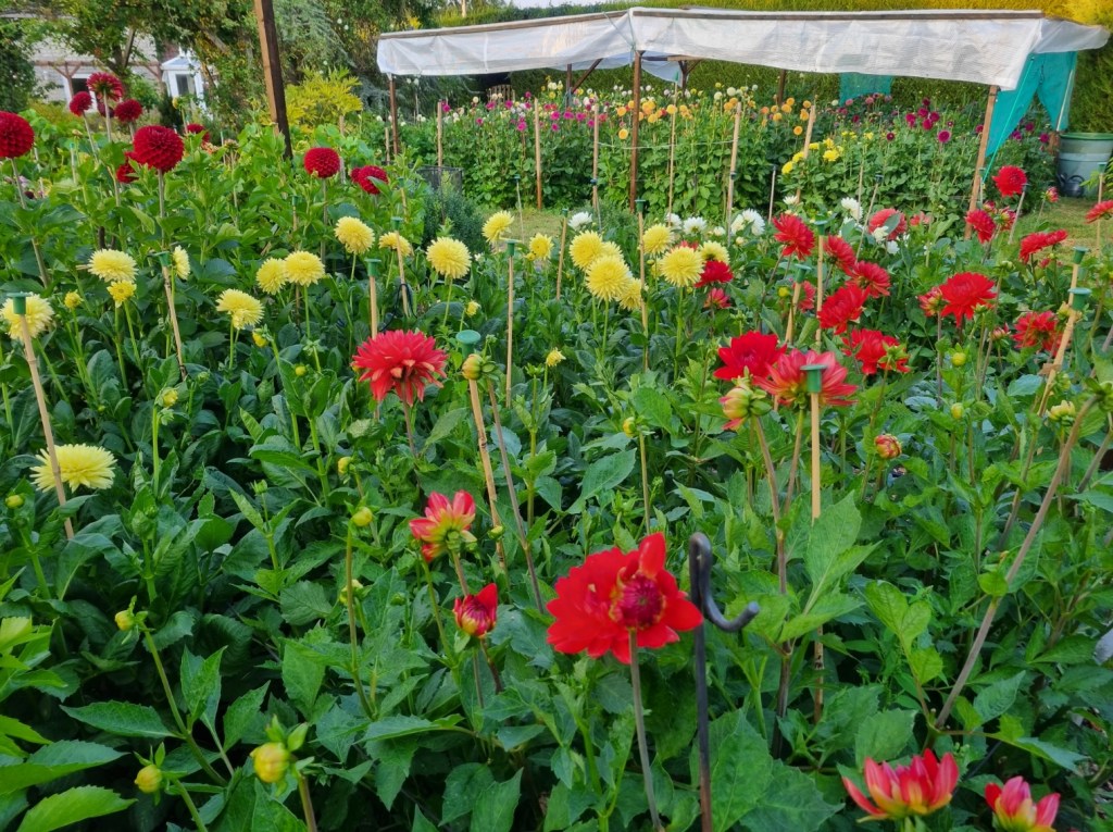 Early September and the dahlias are at their peak for colour, though now going past their best for showing. With few/no shows this year, we let them come earlier than normal rather than time them for individual shows.