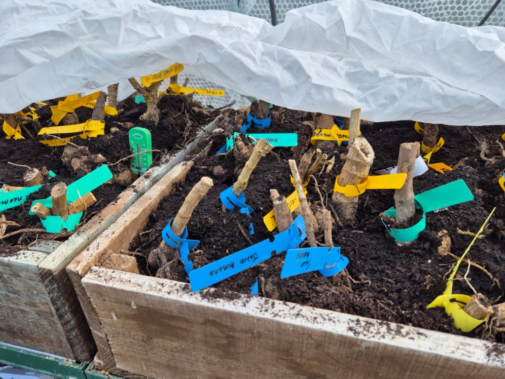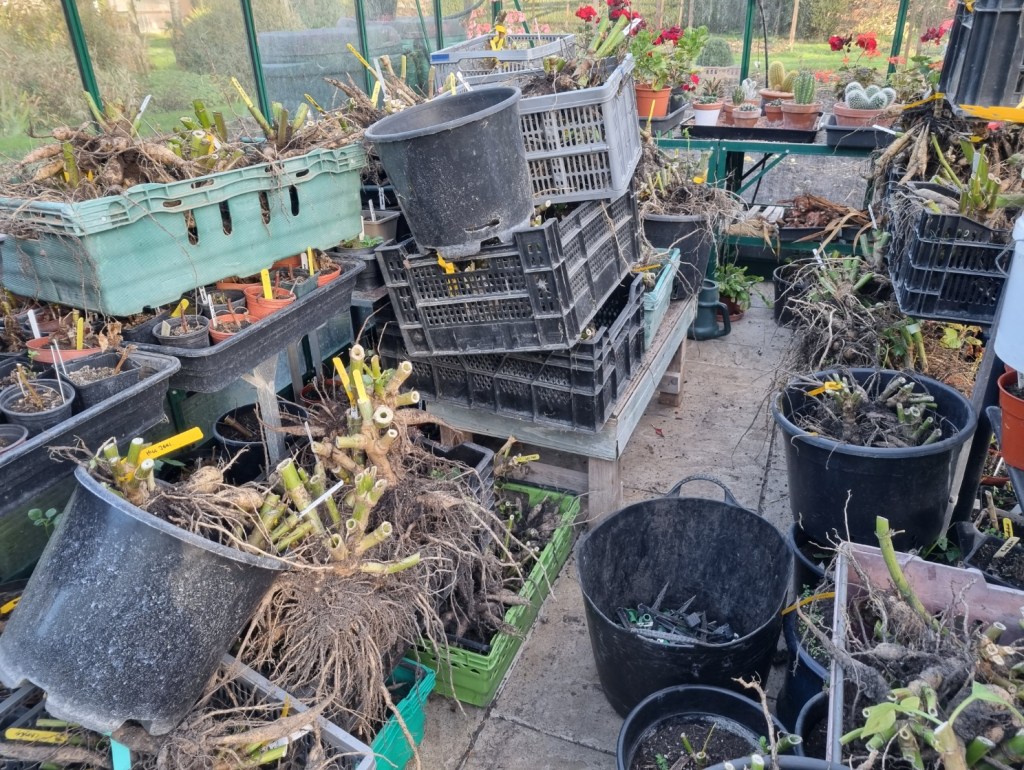 The dahlias have been moved into the greenhouse from their storage location in the garage. They need a bit more tidying up. There is minimal heat on so far – with more cold weather forecast they are safer here than where they were!