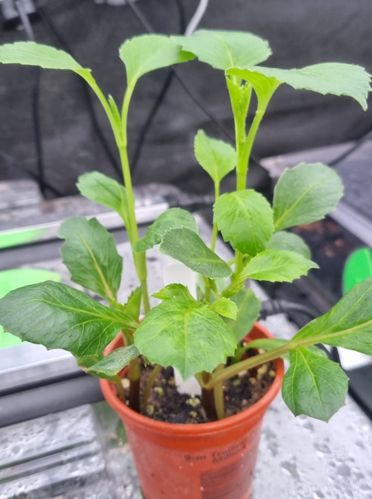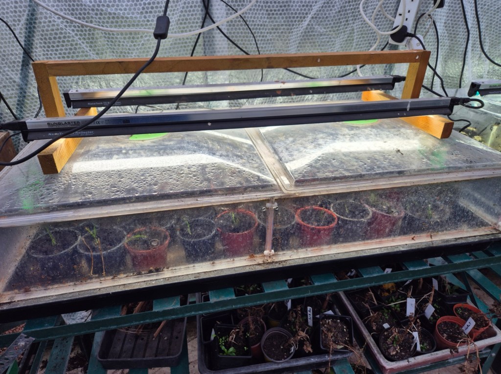 The first dahlia cuttings of the season, taken on 23 January, are stretching up and look like they are nearly ready to pot up. Will leave a few days yet, as appearances can be deceptive! These 5 plants of Mary Margaret Rowe (med Dec)& Kilburn Glow (Wat) will likely be used as ‘mother’ plants (to generate more cuttings). Cuttings mix is equal parts perlite, horticultural sand and multipurpose compost, rooted in a Geopod set at 19 degrees with T5 grow lights to boost light levels.