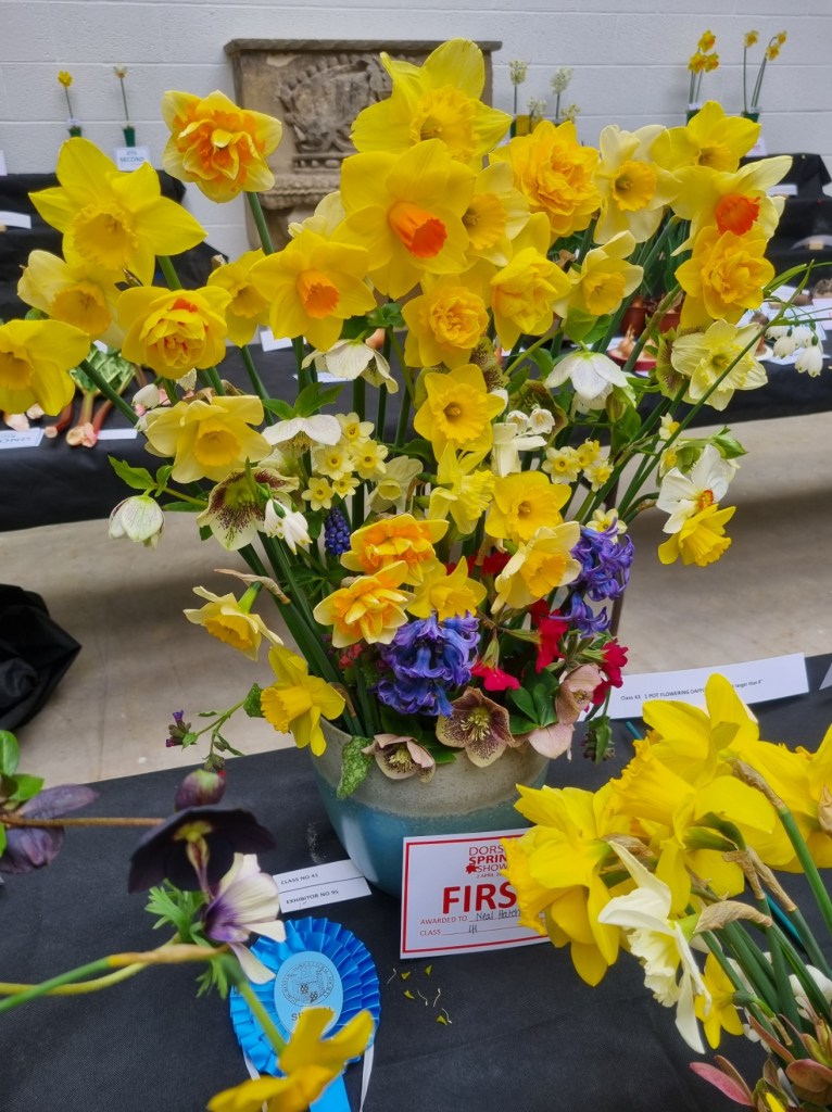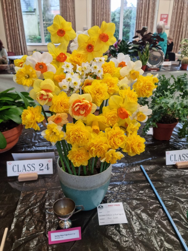 My first show of the season – Broadwey and Upwey. Took enough blooms from the small polytunnel to stage 20 vases of dafs plus this container of mixed daffodils.