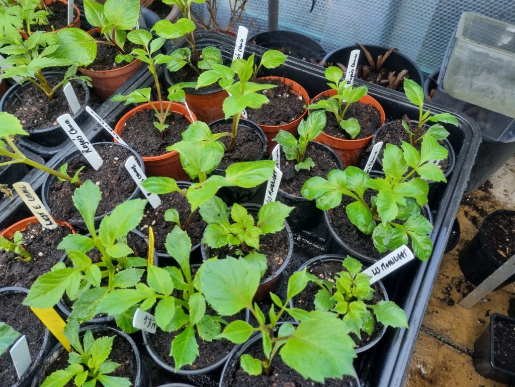 A busy time in the garden. The very first pot of dahlia cuttings is now out of the propagator – Hillcrest Charlie, Tracy Diane, and 2x Ruskin Andrea. Ready to pot up.