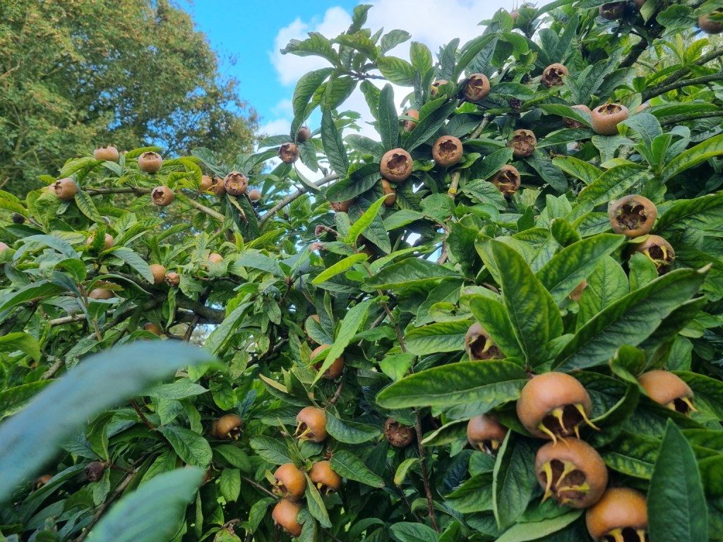 At the end of September – the apples and pears in the orchard are looking good. Quite a heavy crop on this medlar – ‘Nottingham’. Destined to be turned into medlar jelly in late November/early December.