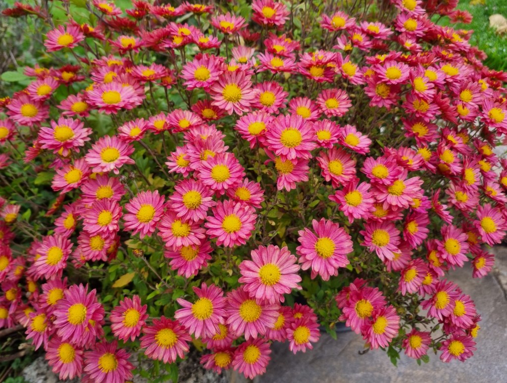 Nearing the end of the season – the charm chrysanthemums have finally come into flower on the patio. This is Jenny Wren. Hopefully, they will survive the first hard frosts and will keep flowering into early December. Most of the other early-flowering and late-flowering chrysanthemums are safely tucked up in the greenhouse. We will soon be thinking of getting ready to take cuttings for next year!