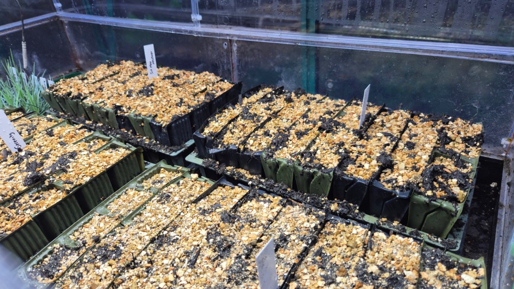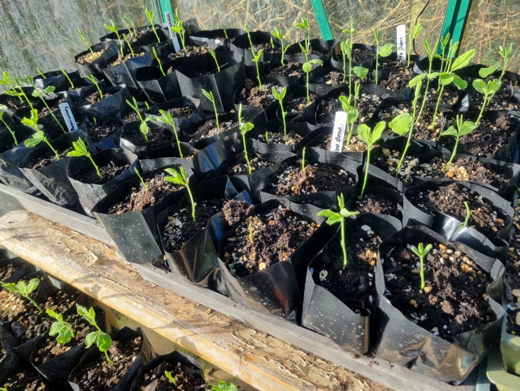The first batch of sweet peas (Jilly) are out of the propagator – and stabilising in the frost-free insulated greenhouse before transferring to the cold greenhouse in a couple of weeks, unless we get a really cold snap!