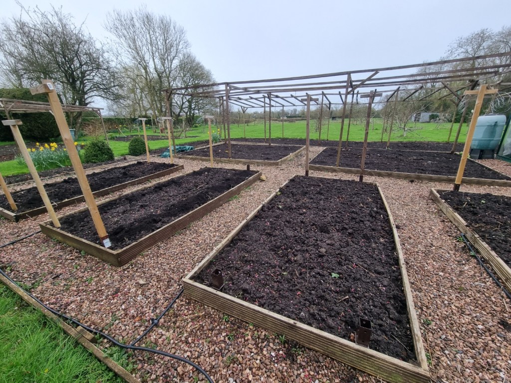 Garden compost added to beds and starting to weed the beds ready for another year! A few late daffodil pots are shown in the foreground.