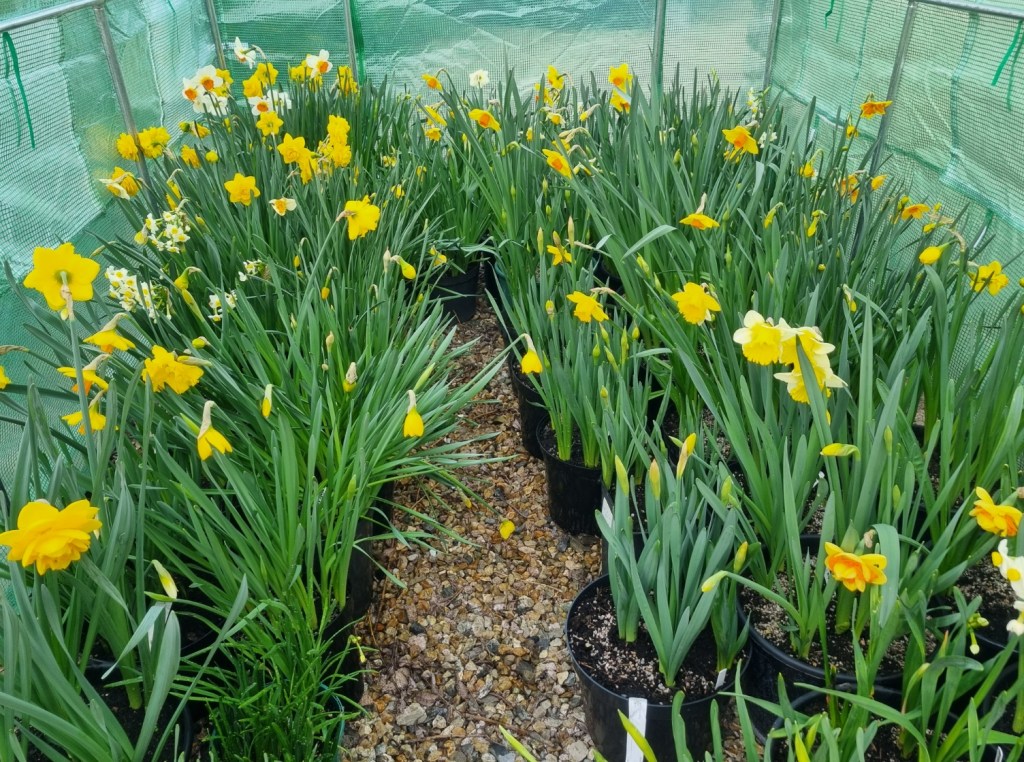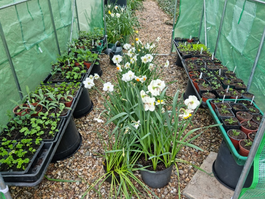 Daffodils in pots now coming into full bloom. Hoping to find a few blooms for upcoming spring shows at Broadwey and Keynsham. This small tunnel can then be used to protect other plants, currently starting off life in the greenhouse.