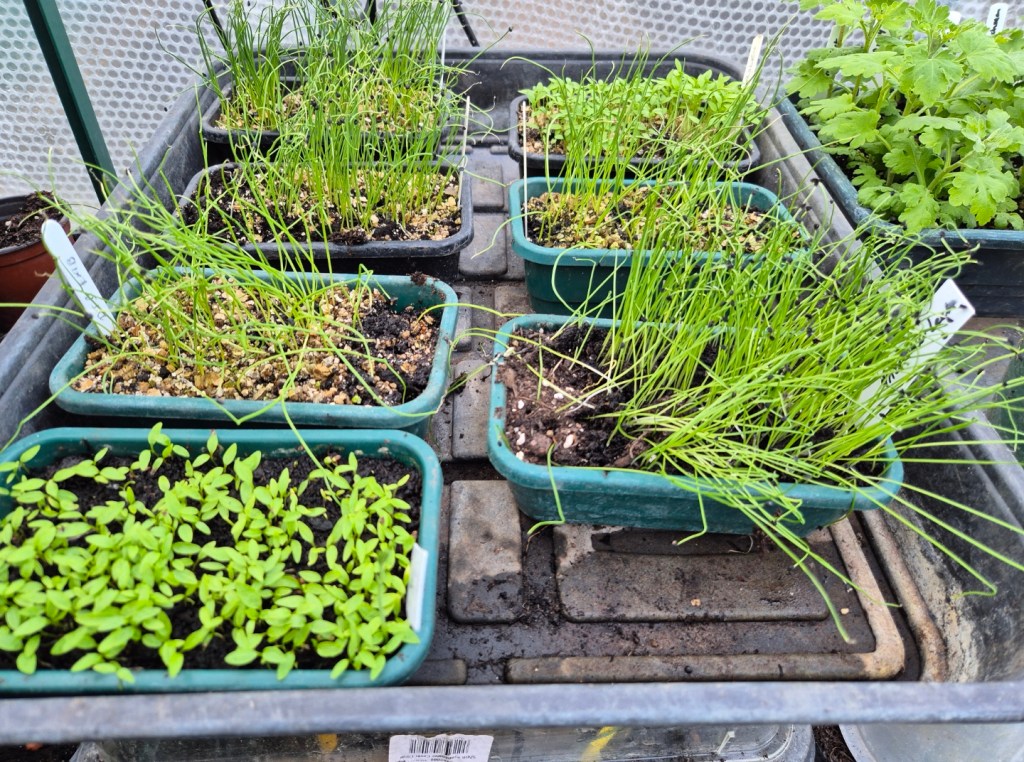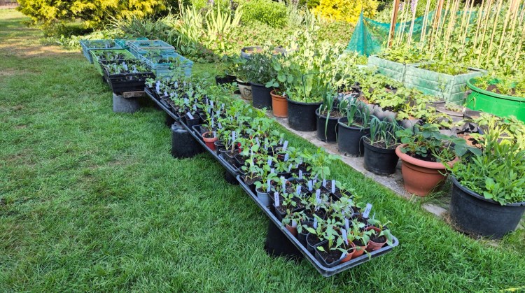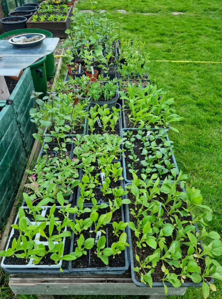 The greenhouse is full, and plants are spilling out into the small polytunnel – which is giving them some protection from the wind and rain. Most of these are destined for the garden but a few will make it to our local garden club plant sale.