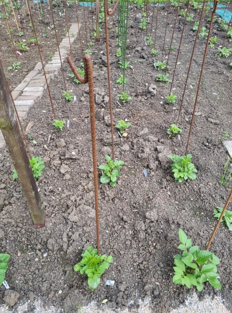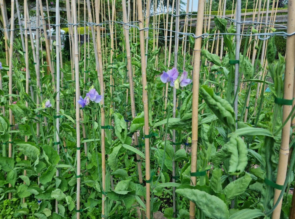 The first colour is showing on the sweet peas. A little later than in 2023. The dull wet weather in May has made the plants put on good growth, but it has not been warm or sunny enough to bring on the flowers. Fingers crossed we can make it to the early shows!