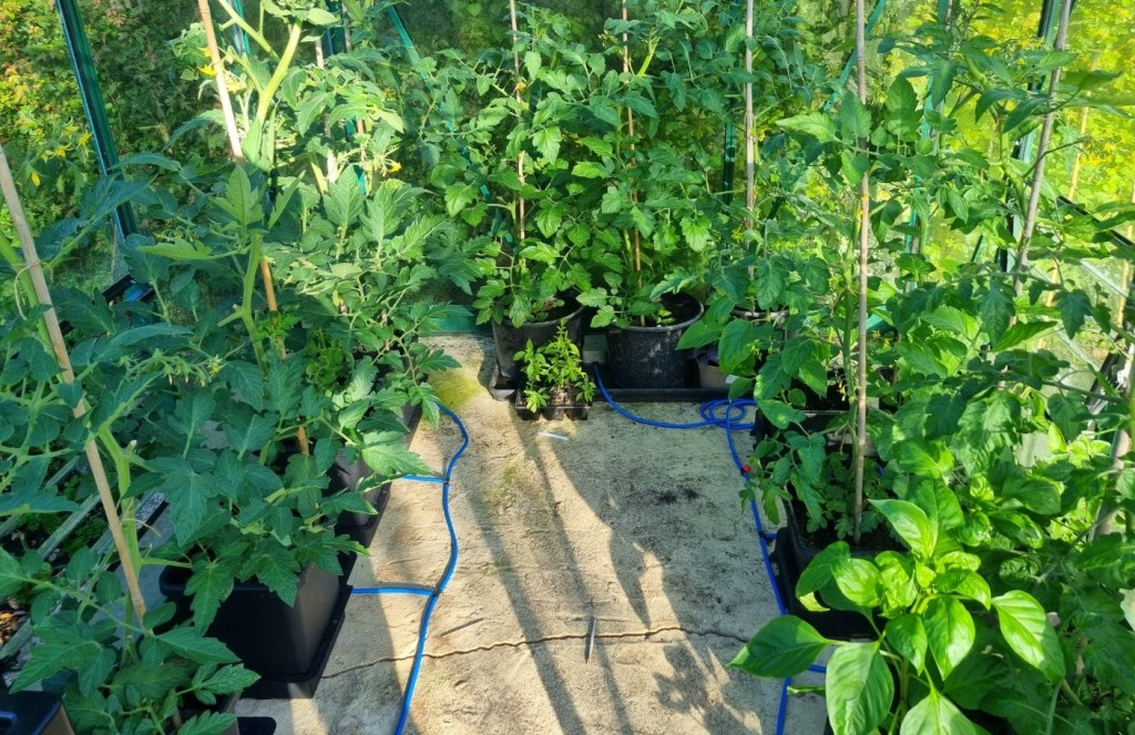 An experiment in the smaller greenhouse using ‘Autopots’ – an automatic watering system. It is gravity fed from a water tank also containing liquid feed. I am fascinated to see how the plants do.