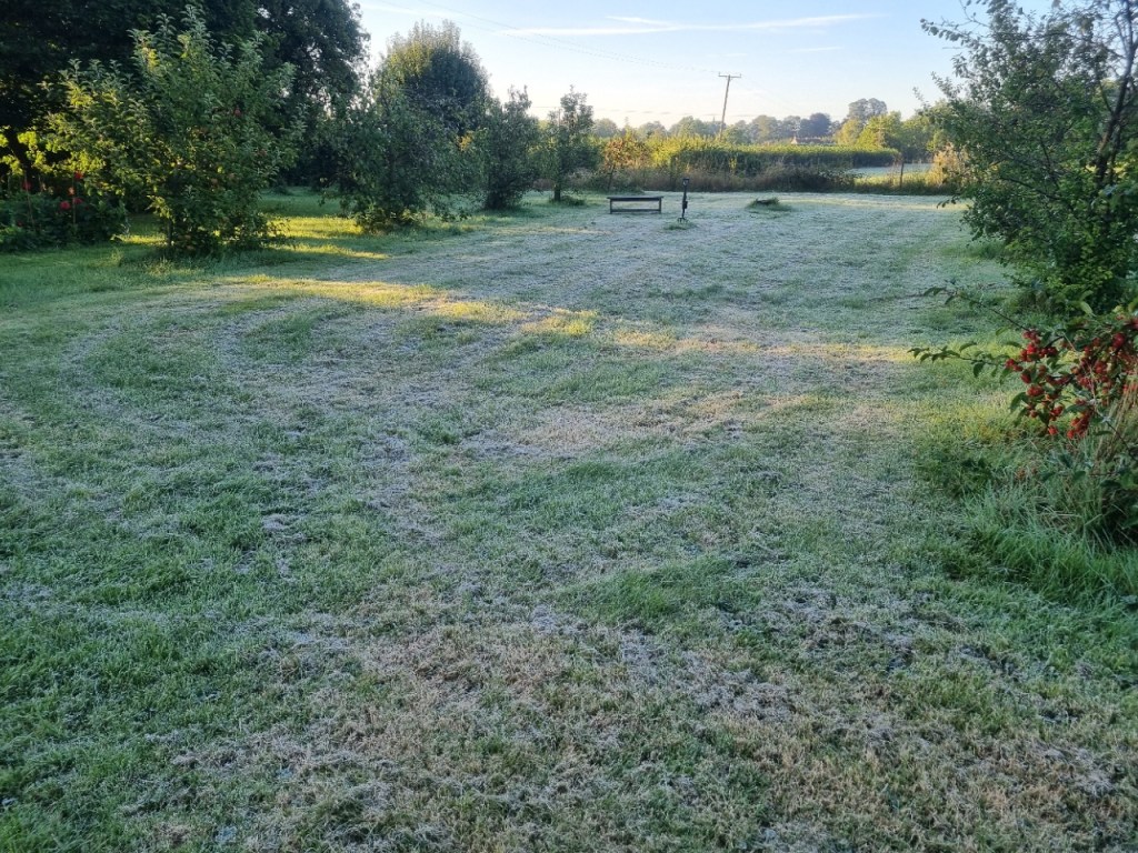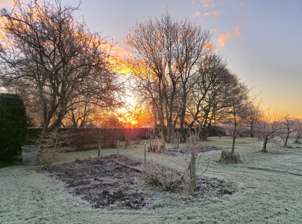A very cold morning – 6C. Sunrise over the orchard. The eagle-eyed will spot that some tidying up is needed on the dahlia seedling beds in the foreground- but plenty of time for that.