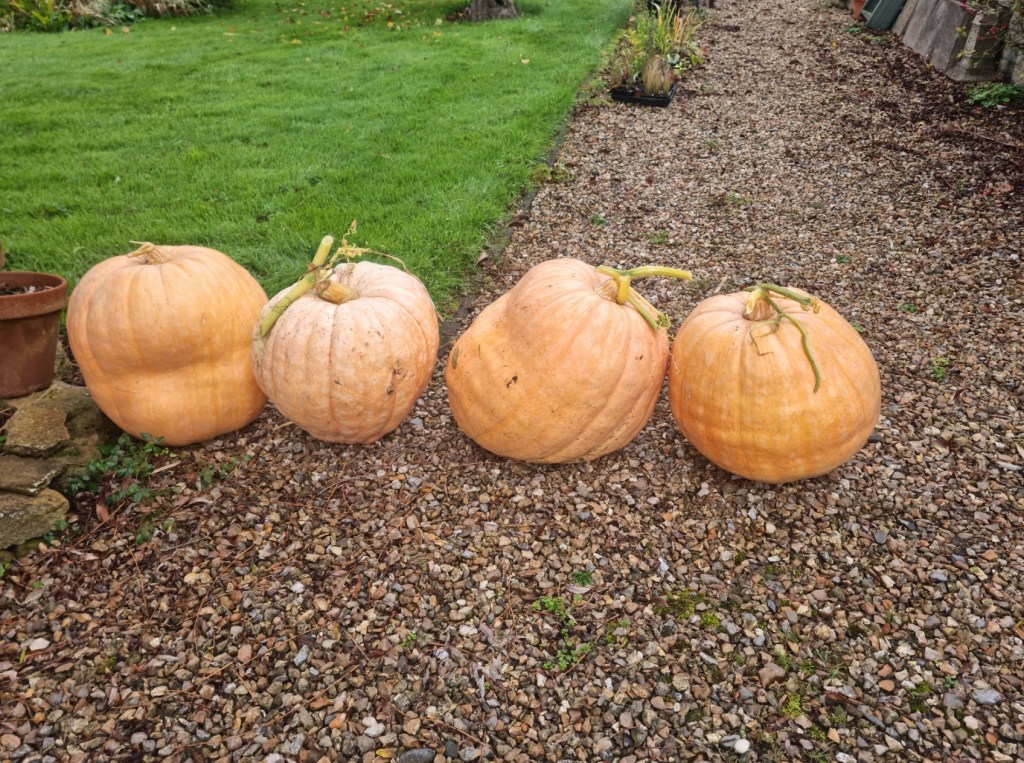Not quite sure what I’m going to do with these pumpkins (Dill’s Atlantic Giant) – each weighs about 30kg, and they were grown (and neglected) on last year’s compost heap. Grown for fun – and a bit of a display/talking point in the driveway! We prefer to eat our butternut squash!