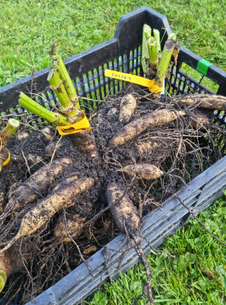 After the ‘big dig’. That’s all the tubers dug from the garden – after a very early frost for us this year. Digging was hampered a bit by the rain and muddy conditions too – but glad to get them all in. Now the drying and sorting begins – so order will be restored soon!