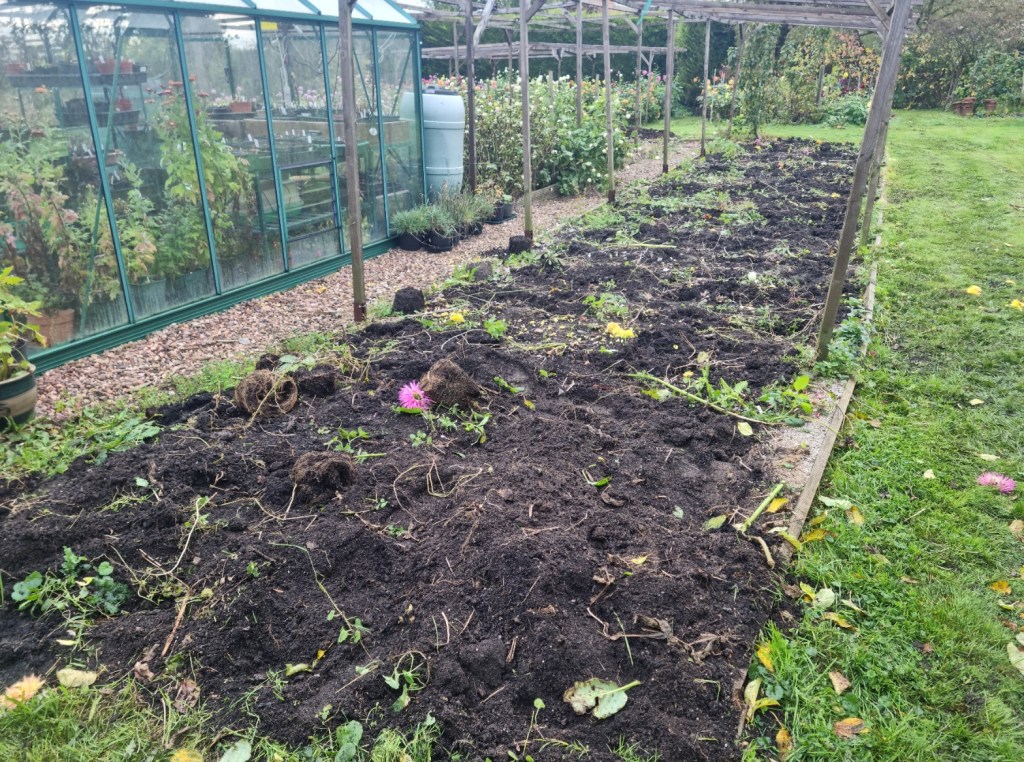 Oh dear, what a mess! This was the Taunton dahlia bed after the tubers have been removed – many of them will be heading to Yeovil Late Chrysanthemum Show and Tuber Sale. The tubers are drying in the greenhouse before being cleaned up for the sale or for storage. The bed now needs weeding and turning – it will be left fallow over the winter before it is prepared again next spring. Only 300 or so left to dig up!