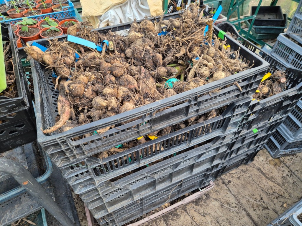 Dahlias processed (cleaned of soil, trimmed and labelled) and finishing drying in the greenhouse – very nearly ready to transfer to the (frost free) shed for storage.