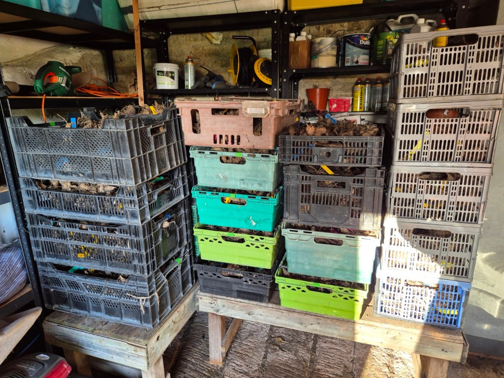 People often ask me how I store my dahlias. With heavy frosts now on the greenhouse and the tubers dry enough to store, they’ve now made the move to the back of a (frost-free) stone garage block. They are stored in a variety of crates – some of which I have had for 30 years. There is no other packing, but they will have some old curtains on top of them for the worst of the winter. I check every so often to make sure they are ok.