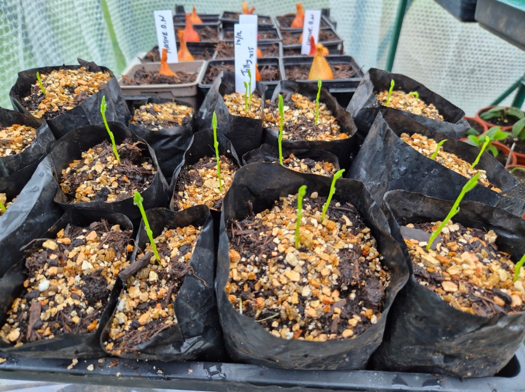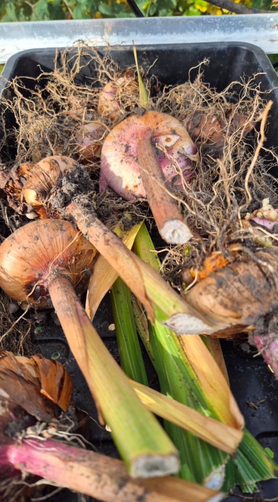 Autumn and the clearing up begins – gladioli corms drying in trays in the greenhouse. These will be cleaned up when fully dry – and made ready for replanting next year.