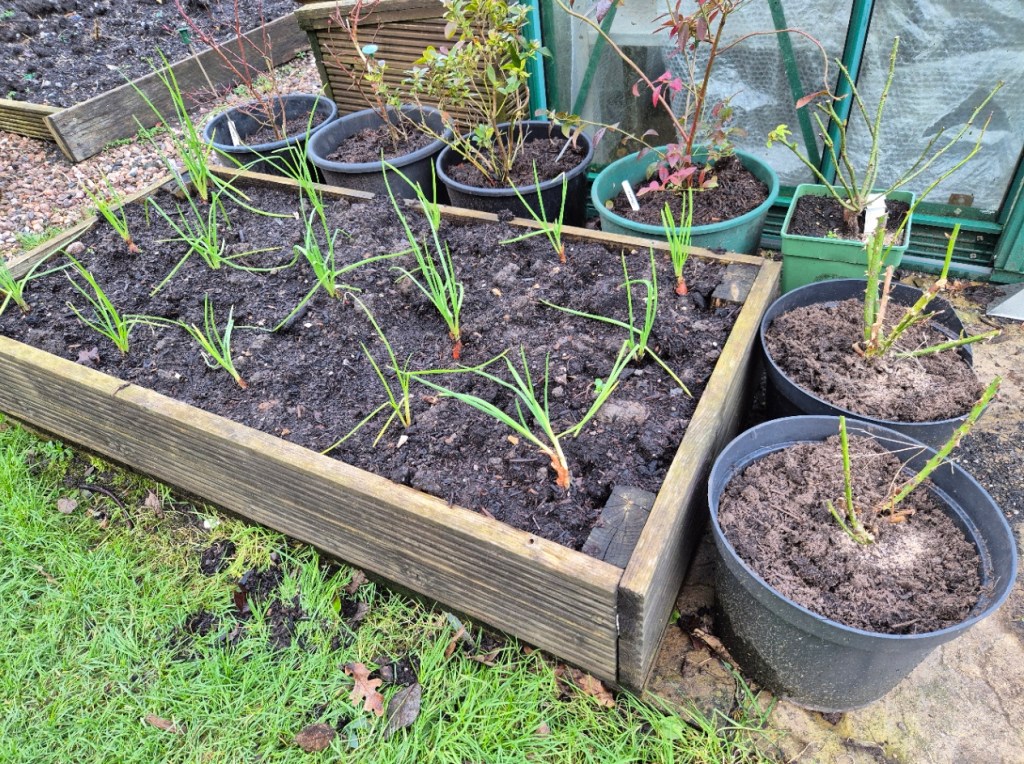 With the weather so bad outside it is difficult to do anything on the ground so the usual winter ground preparation and fruit tree pruning is well behind schedule – but I did manage to plant a few shallots and tidy up pots of blueberries (using ericaceous compost) and some pot roses – mostly miniatures.