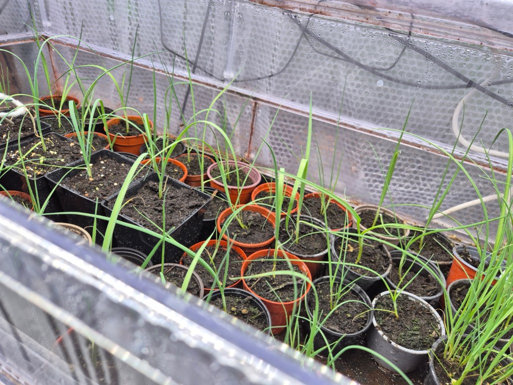 A sneaky look inside the double-height propagator where the large leeks are starting to move on a bit now. Unfortunately, they will have to be kicked out into the greenhouse soon – when seed sowing and dahlia cuttings get fully underway.