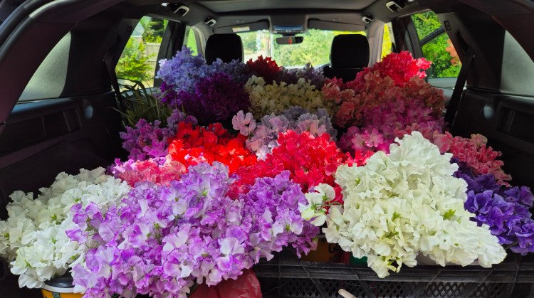 Off to the show we go! Too packed in the car really – but my first attempt at transporting blooms for 24 vases of 15 stems. I will need to take fewer, or plan for a van next year!