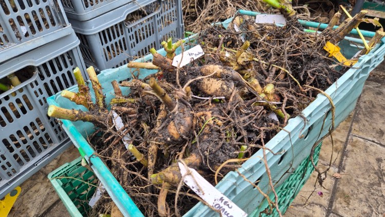 Dahlia tubers trimmed to about 15cm, dug and roughly cleaned/labelled before putting into crates for drying in the greenhouse. After drying for a few weeks, they will have their final inspection, trim and clean before being stored in a frost-free garage until needed next season.