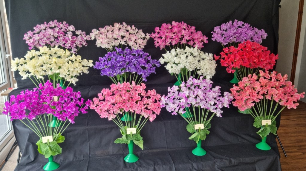 It was very sad to hear that the Early Sweet Pea Society National Show at Wisley (26-27 June) was cancelled. I had a lot of blooms with no show to go to, so I cut and staged my exhibits at home. A few photos of what I had hoped to put on the show bench…..