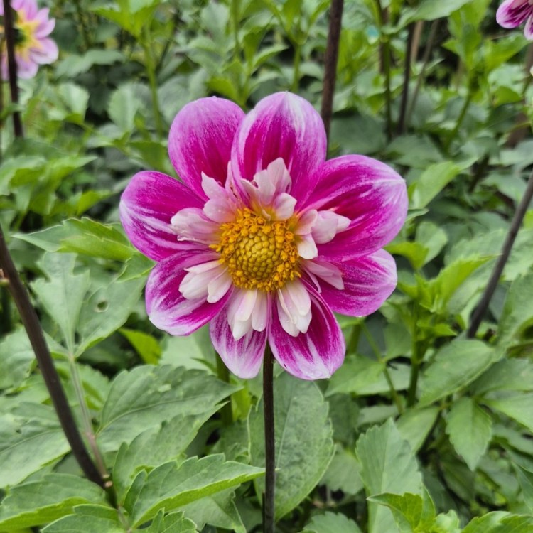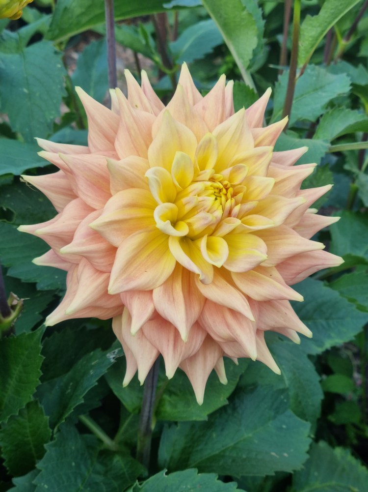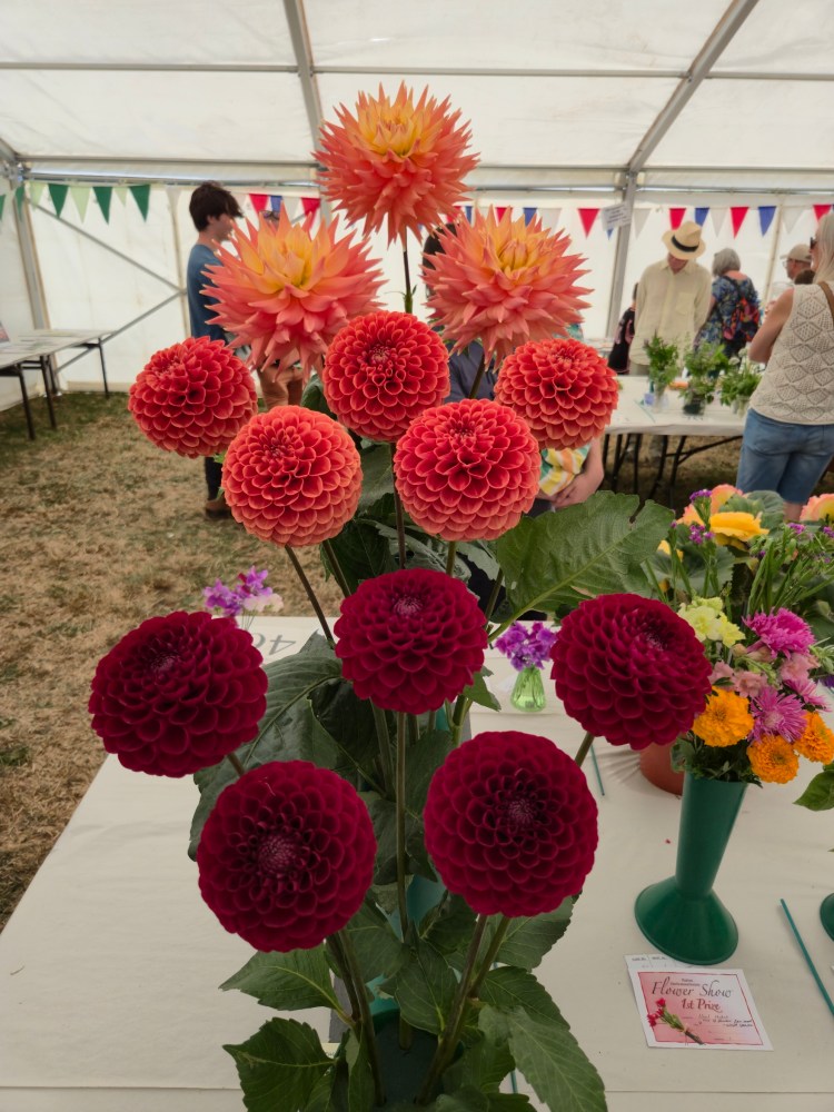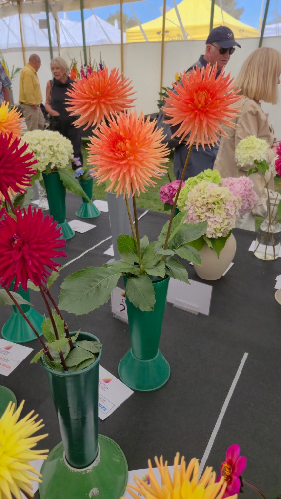 These dahlias were originally grown from crosses made in the garden. The resulting seedlings were grown to flowering the next year. The best plants were selected and the tubers from those were saved over the winter. New plants were generated from cuttings in the spring and grown on in the subsequent year. These were the best varieties we’ve grown so far, and all of these have now appeared at flower shows around the area (either in a single-variety vase or as part of a cut-flower mixed display). They have been named (and registered with the RHS) to make it easier to track and describe them!