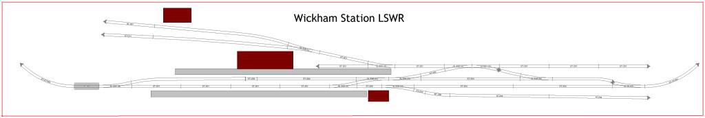 Track plan for Wickham Station, LSWR. Wickham was on the Meon Valley Railway, which went from Fareham to Alton (via Butts Junction). Click on the link for some Sketchup mock-ups of the station building, waiting room and signal box. A model of the signal box and station building can be seen on Gorston II photos.